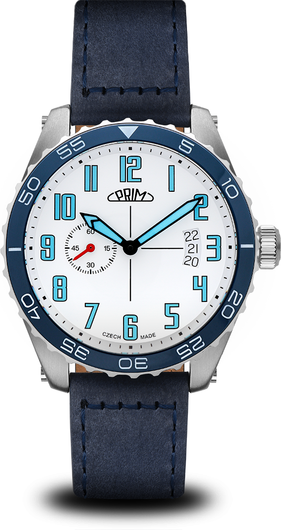 Limitovaná edice PRIM Aviator je osazena kvalitním švýcarským kalibrem Sellita SW 290-1. Tento elegantně sportovní model s výraznými luminiscenčními čísly a keramickou lunetou chrání nejdokonalejší antireflexní safírové sklíčko. Samotná keramická luneta je doplněna minutami s tradičním pilot trojúhelníkem a čárky připomínající umělý horizont. Limitovaná série 50 kusů v modro bílé verzi a 50 kusů černo hnědé.