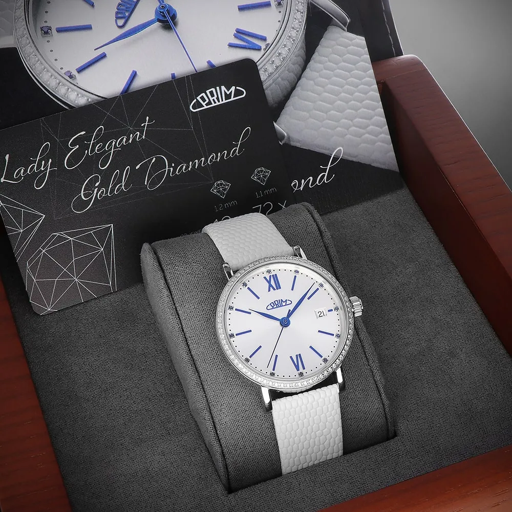Limitovaná originální edice PRIM Lady Elegant Gold Diamond vyzařuje klasickou eleganci, podmaňující si srdce žen. Tyto automatické hodinky jsou stvořeny pro všechny dámy, které od svých doplňků očekávají nejen trendy vzhled, ale i vysokou kvalitu. Hodinky jsou vyrobeny v celkovém počtu 40ti kusů, 10 kusů každé verze a jsou individuálně číslovány.
