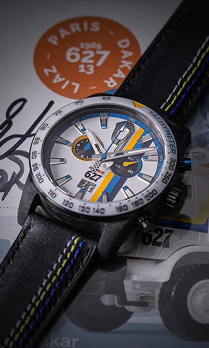 The overall look is completed by a white ceramic tachymeter bezel, tuned to the traditional LIAZ colours. A subtle detail is the Dakar LIAZ engraving on the inner side of the case.