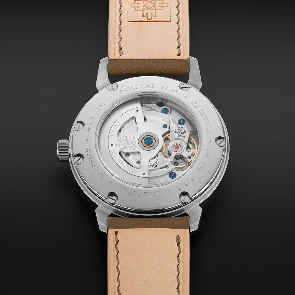 Przez szklany klosz zegarka widać mechanizm manufakturowy PRIM kaliber 98.00 z automatycznym naciągiem. Dzięki 22 kamieniom łożyskowym, mechanizm wykonuje 21 600 wahnięć na godzinę (3 Hz). Rezerwa chodu wynosi co najmniej 48 godzin. Mechanizm zdobi symbol czeskiego lwa i piktogram. Ręcznie barwione, niebieskie śruby również przyciągają wzrok już na pierwszy rzut oka.