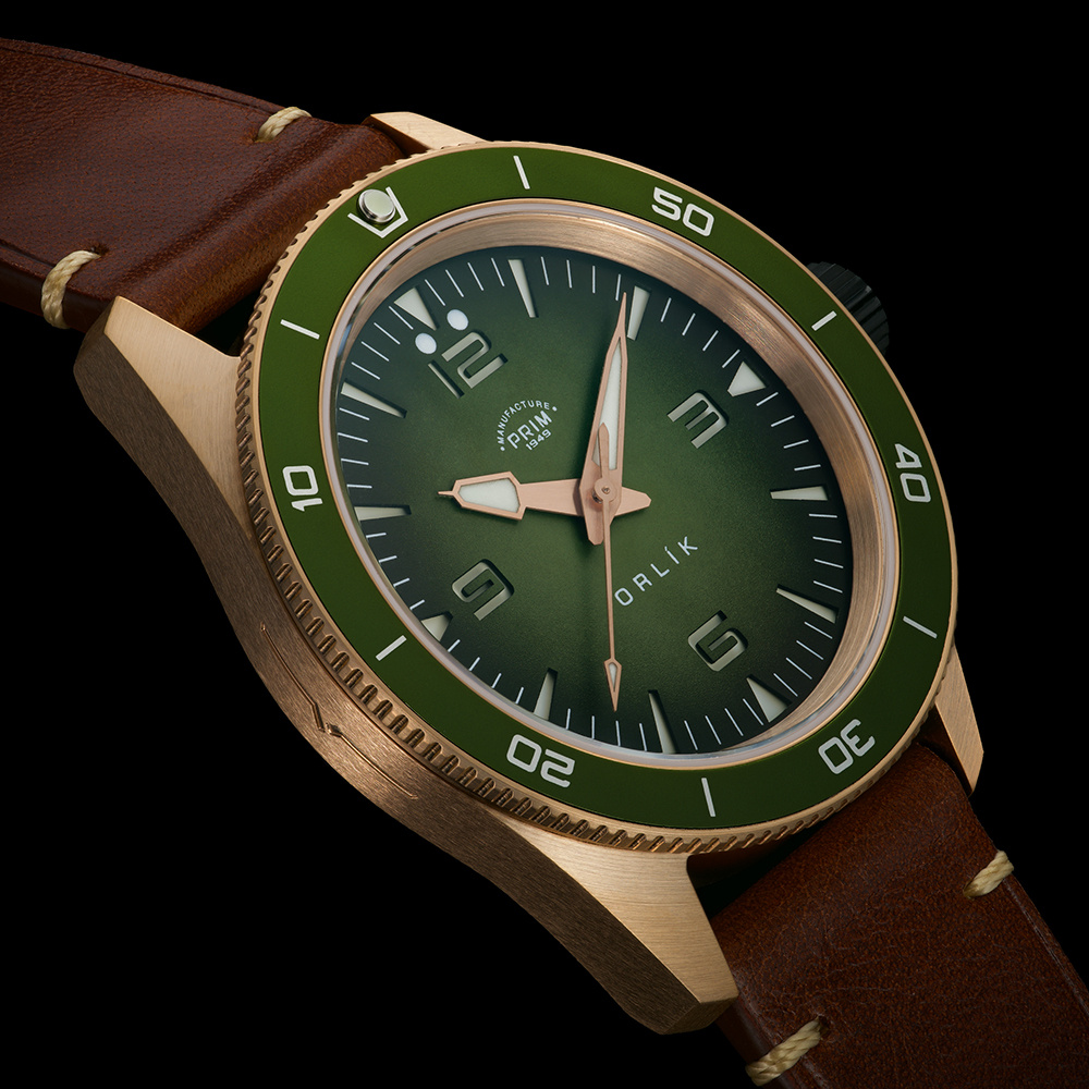Barvy pro číselník a lunety byly pečlivě vybrány našimi designéry tak, aby souzněly s materiálem hodinek v jakékoliv fázi zabarvení pouzdra. Bok hodinek zdobí vyrytý symbol modelu Orlík.