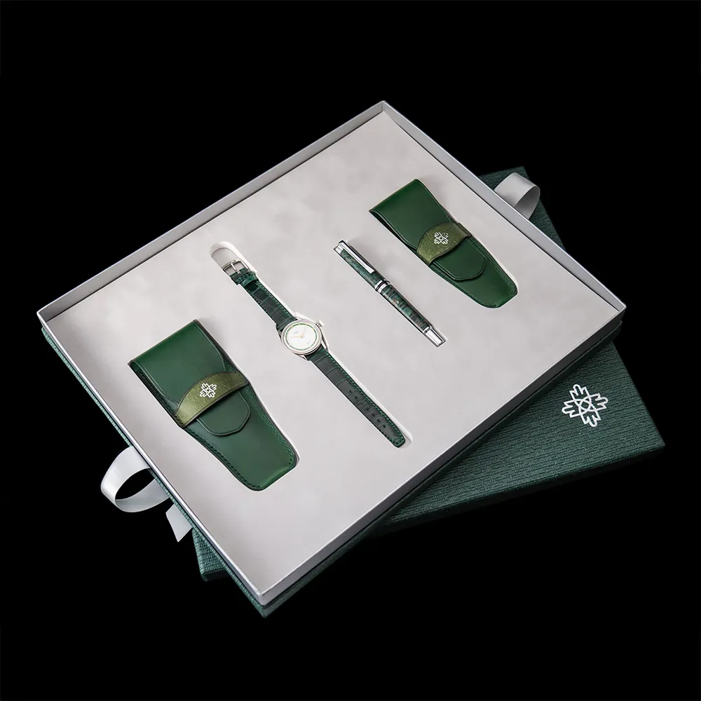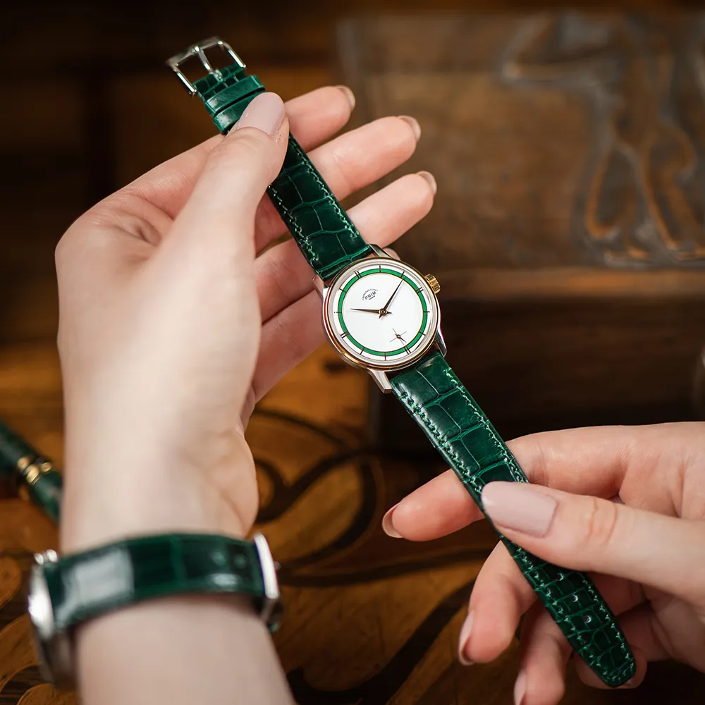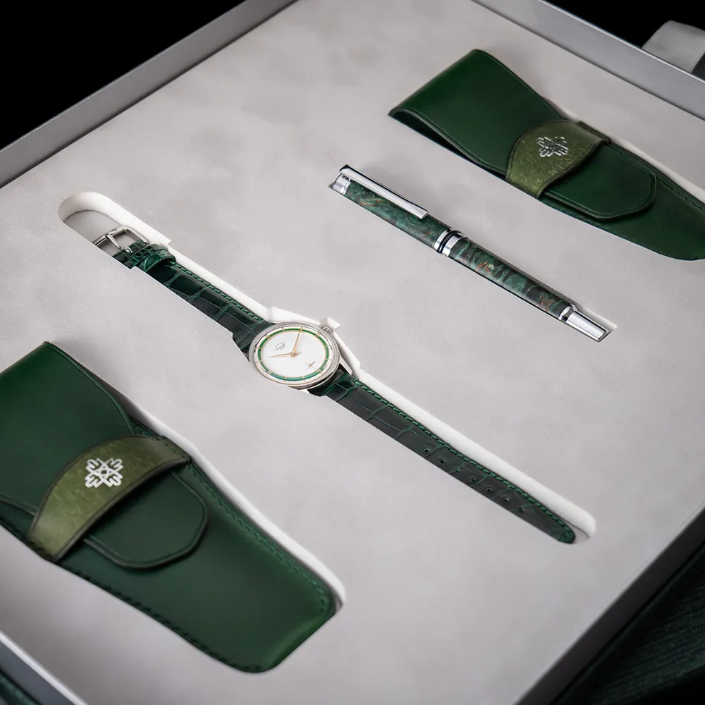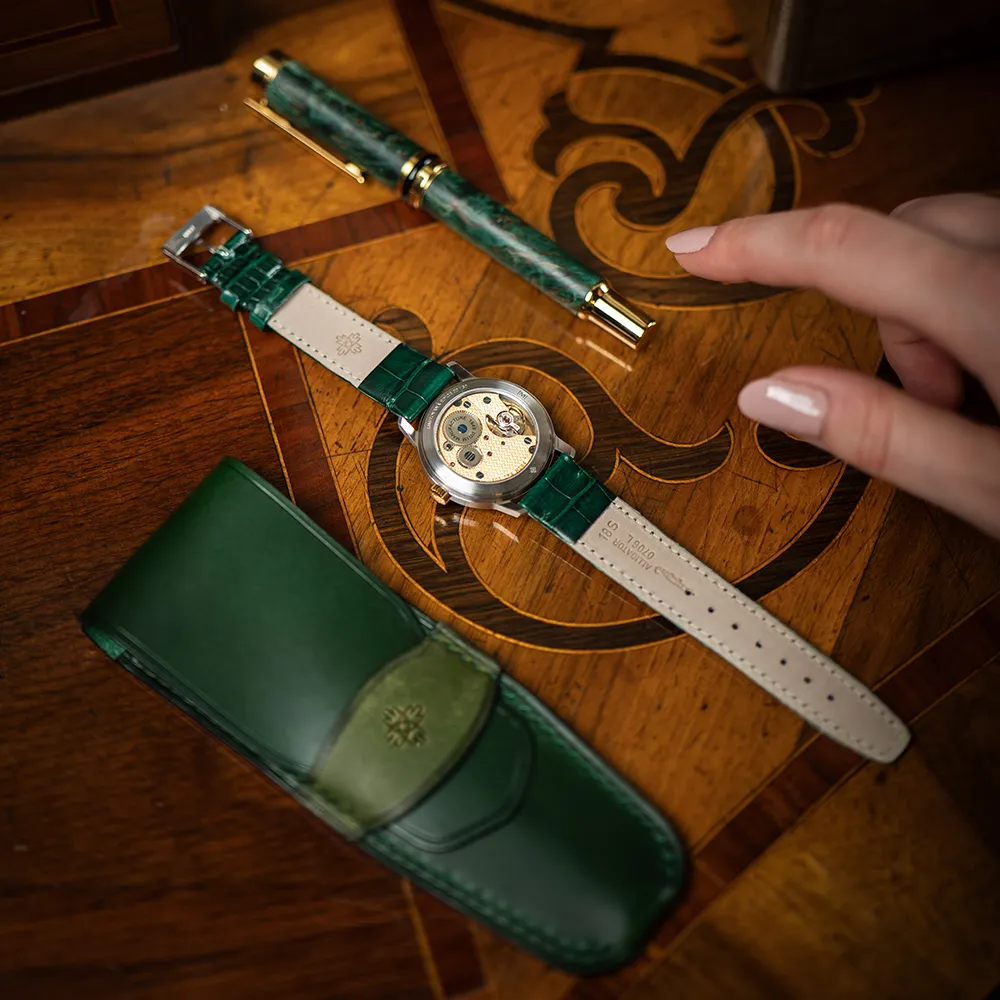 Farebne krásne doladený remienok z kvalitnej kože nie je jediným doplnkom, ktorý si získa srdce mnohých obdivovateľov. Tento model je pripravený v luxusnom sete. Ten obsahuje aj exkluzívne plniace pero zo smaragdovo zelenej karelskej brezy. Odtieň dreva je pripravený iba k tomuto unikátnemu modelu hodiniek. Farebné prevedenie mechaniky pera je prispôsobené na prevedenie puzdra hodiniek. Autorom týchto pier je česká manufaktúra
