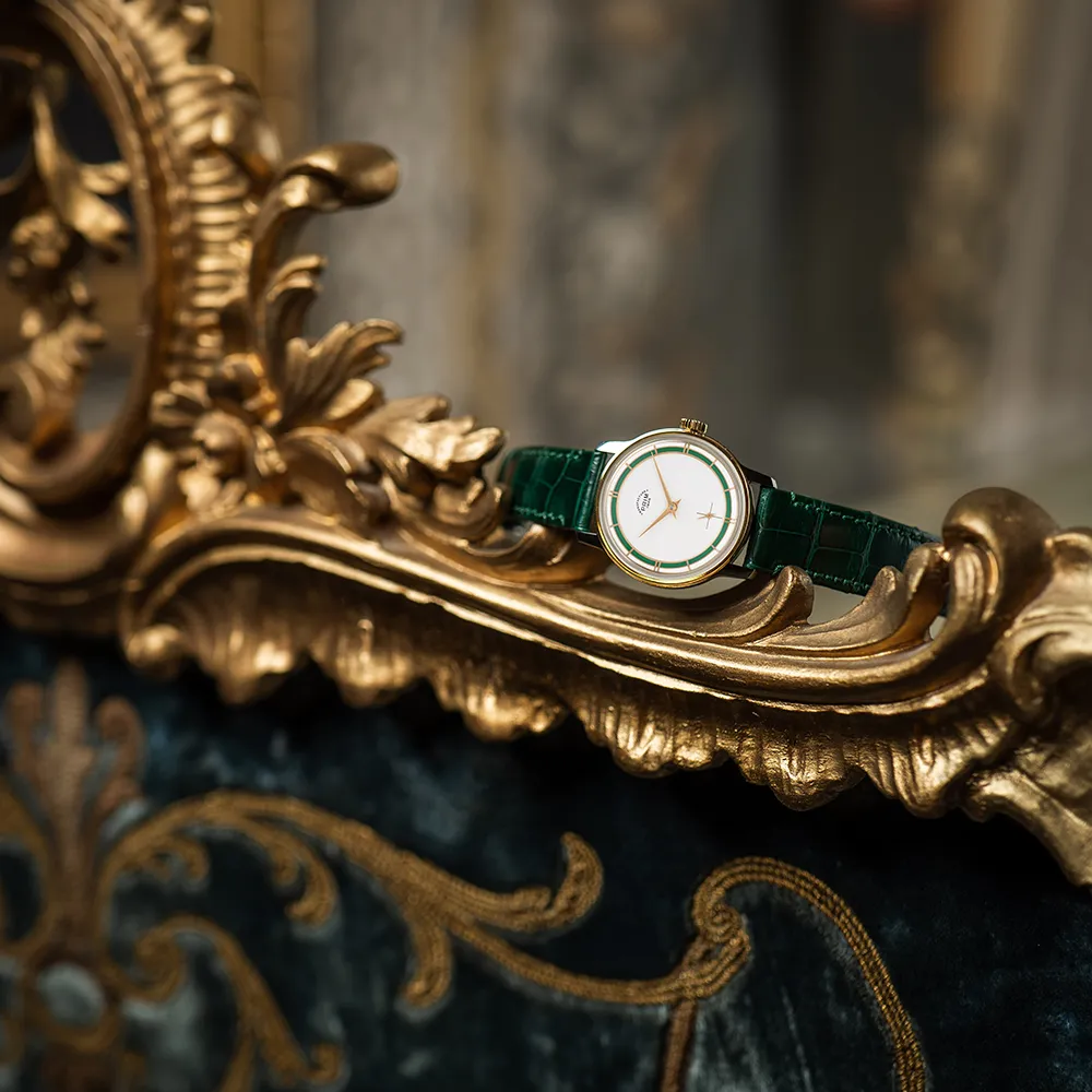 Zlatá, zelená a biela farebná kombinácia týchto minimalistických jemných dámskych hodiniek na prvý pohľad radí tieto „traktory“ do kategórie luxusu a neokázalého vzhľadu. Balenie v sete s individuálne vyrobeným písacím perom z karelskej brezy a sady dvoch kožených puzdier vytvára veľmi výnimočný a hodnotný darček.