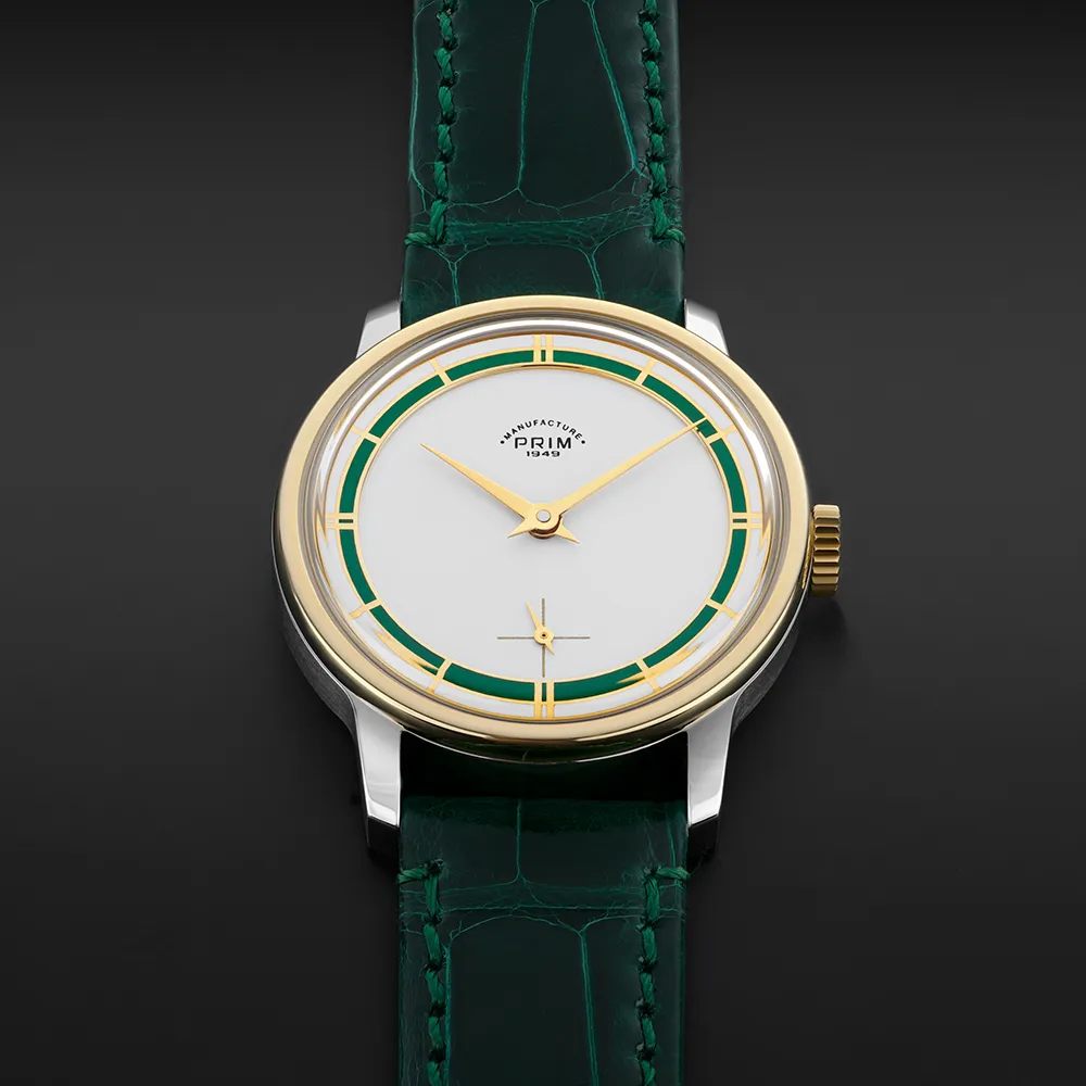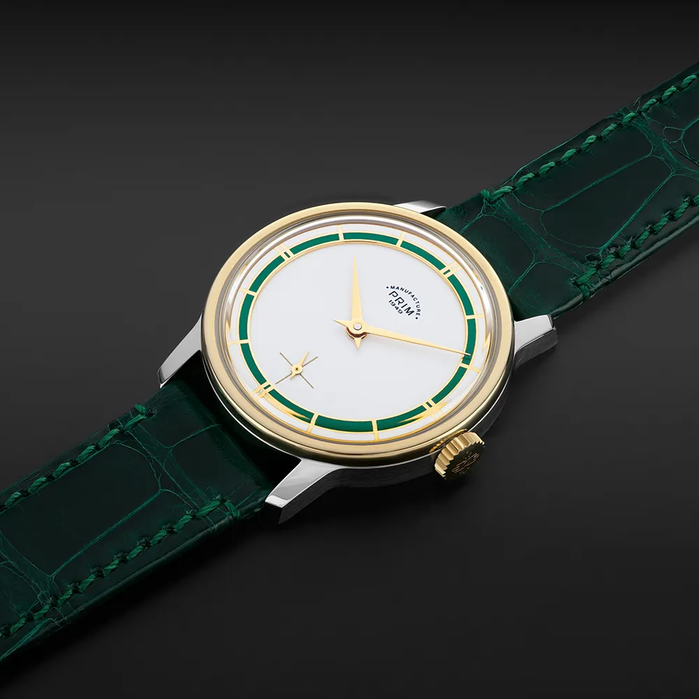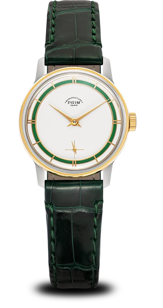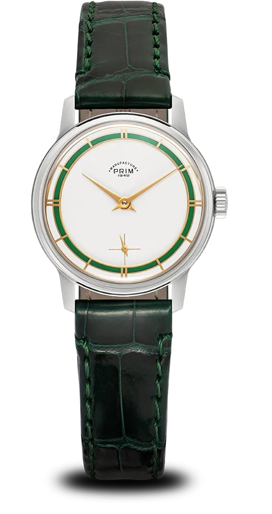 PRIM TRAKTOR 34 LE je synonymom estetiky, minimalizmu a luxusu v unikátnom sete najmä pre dámy. Je pokračovaním spoločenského modelu, ktorého design nikto nikdy neprekonal. Prevedenie vo farebnej kombinácii zelenej, zlatej a bielej potvrdzuje unikátnosť a charizma. Mimostredná sekundová rúčka v minimalistickom prevedení potvrdí vkus, vysoké nároky a silnú osobnosť majiteľky hodiniek.